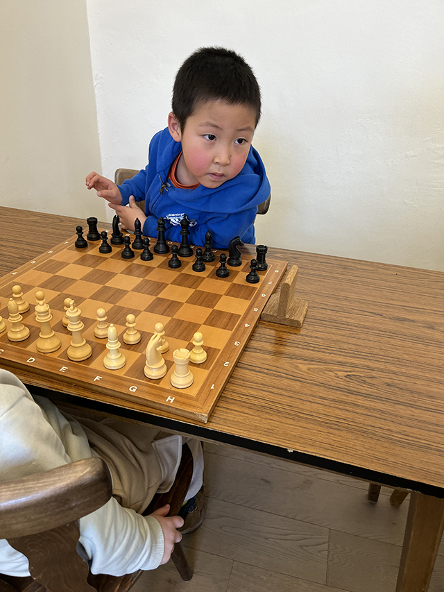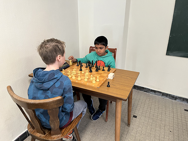 Mattiss was de enige die op twee dagen moest spelen. De heenreis naar het lokaal verliep wat stroef, waardoor we een beetje te laat aankwamen. Op de tweede dag hadden we onze les geleerd en ging de rit naar het Schaakhuis Caïssa een stuk vlotter.